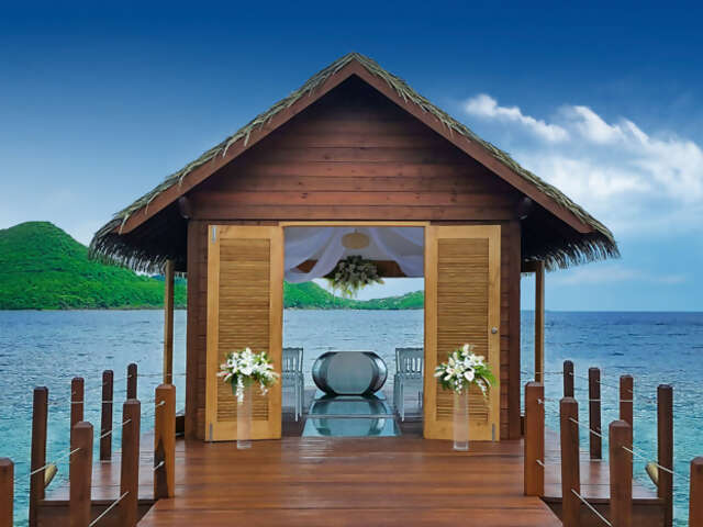 The tranquil Overwater Wedding Chapel at Sandals' Grande St. Lucian is the first of its kind on any island in the Caribbean and offers spectacular panoramic views of Rodney Bay. The chapel's elegant sea–inspired décor includes a beautiful Riverstone alter, a glass aisle made up of three water–viewing floor panels, and an open–air design that invites in the natural surroundings. This unique and intimate wedding venue has enough room to seat 15 guests or accommodate up to 20 guests standing. Use of the chapel is complimentary and can be reserved upon arrival on a first-choice basis.