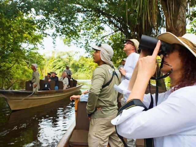 Listen to the many species of Peruvian birds as they call their mates through the leafy canopy. Learn about the habitats essential to the livelihoods of the endangered Amazon river dolphins, taricaya turtles and manatee. Photograph a three toed sloth as he peers down at you while dangling from a nearby branch.