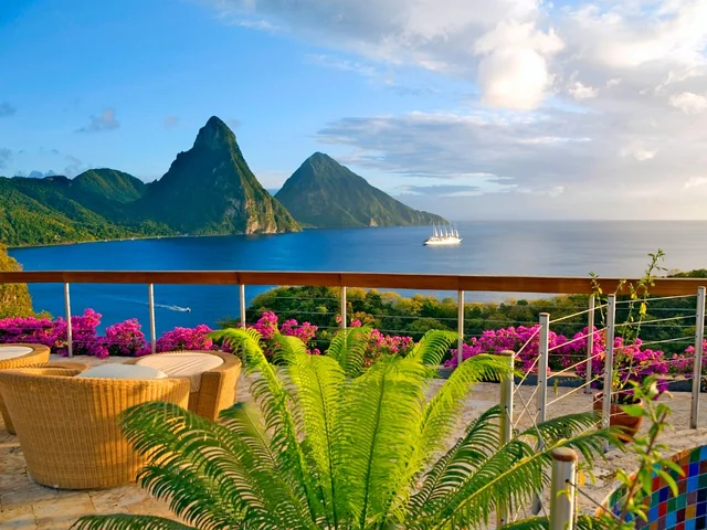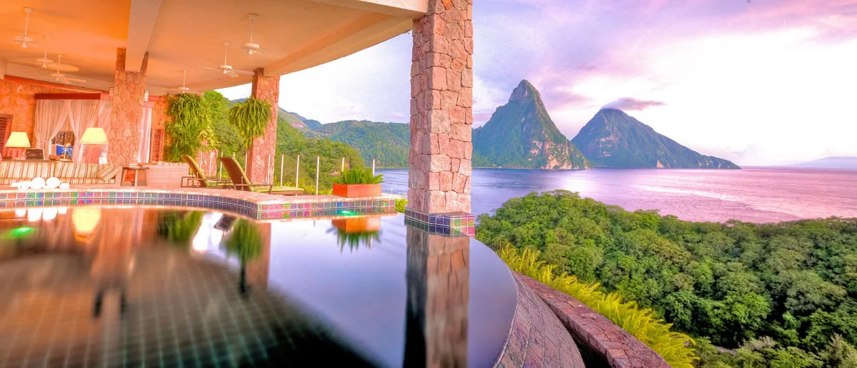 Jade Mountain is St. Lucia's only resort property with the iconic view of both the Piti and Gros Piton mountains floating upon the Caribbean Sea. The location of the property is unsurpassed, rising majestically above the private estate of Anse Chastanet with 600 lush tropical acres bordering two soft, sand Caribbean beaches with pristine coral reefs just off shore.