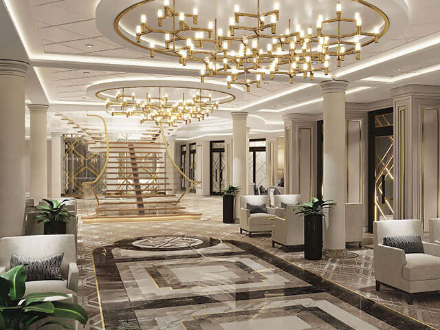 Intricate marble patterns and soaring ceilings topped by sparkling chandeliers adorn your path throughout this exquisite ship.