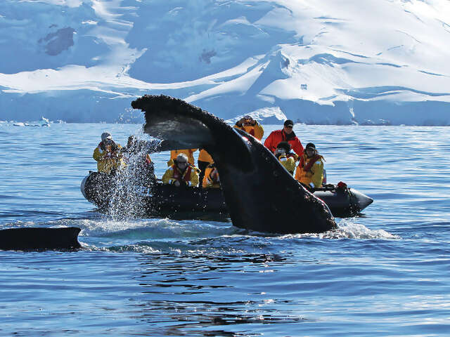 Exploring the South Shetland Islands, you may visit Half Moon Island with its stunning backdrop of mountainous and glaciated Livingston Island. Or perhaps you will sail the ship into an active volcano with an opportunity to take a dip in the relatively balmy waters that surround Deception Island. Bransfield Strait, once the site of an abandoned whaling station, gives you an excellent chance to see whales, which often return to its rich waters.