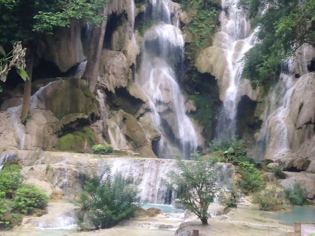 One hour outside Luang Prabang is the beautiful Kuang Si Waterfall and it’s surrounding pools. The waterfall is made up of three tiers of the most brilliant jade green and turquoise colored water. The color comes from the calcium carbonate found in the travertine limestone surrounding the falls. It’s a fantastic place to swim so bring your swimsuit and if you want to hike in the region, bring a solid pair of shoes as the surrounding area is slippery.